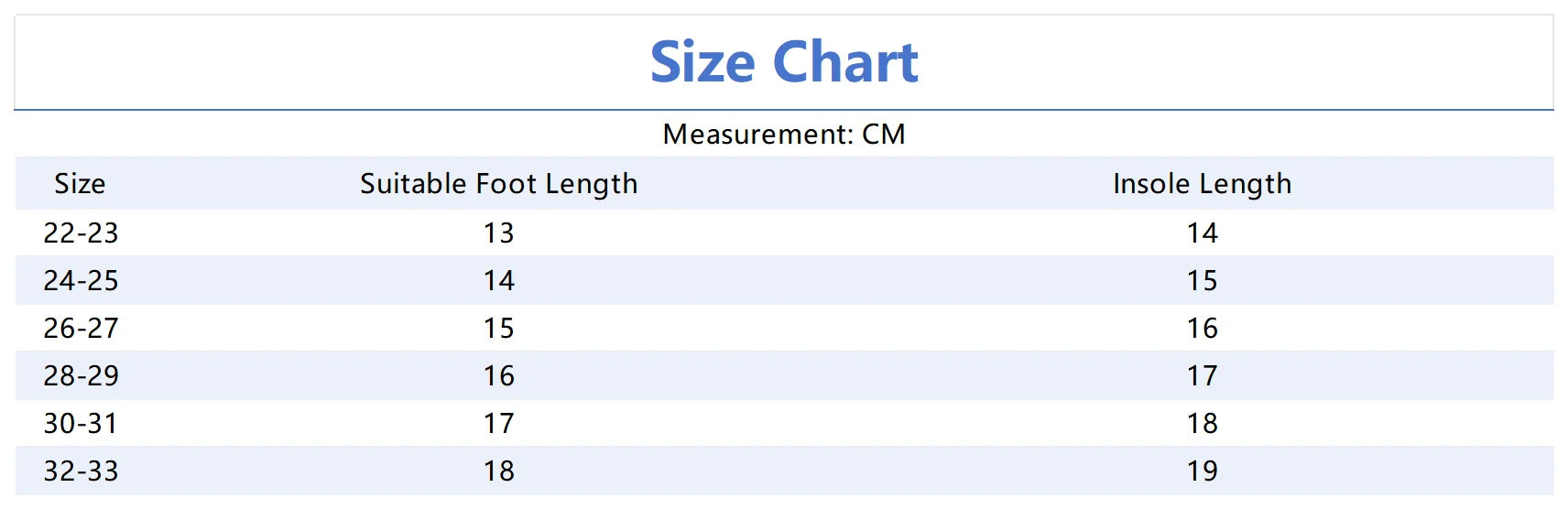 Please note that children's shoe sizes may vary across different countries. To ensure the best fit, we strongly recommend selecting the size based on our provided size chart rather than your usual size choice. If you're unsure, feel free to send us your child's foot length, and we’ll gladly recommend the most suitable size. This will help avoid any sizing issues and save you valuable time by ensuring the shoes fit perfectly from the start!