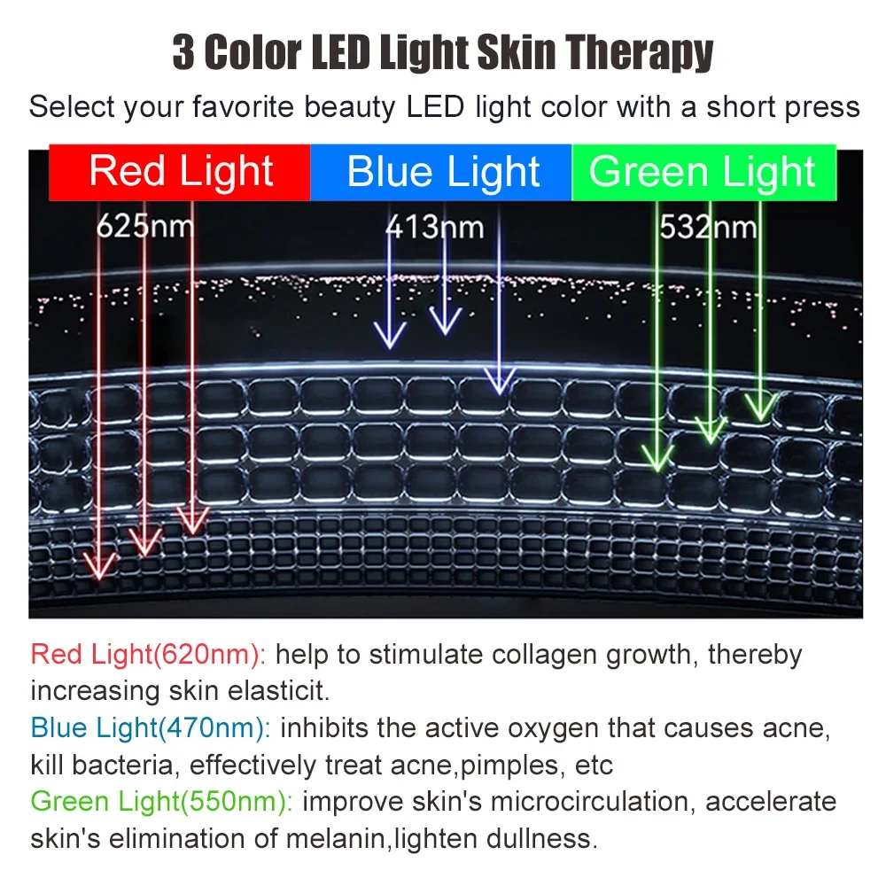 Blue Light(470nm): inhibits the active oxygen that causes acne, kill bacteria, effectively treat acne,pimples, etc