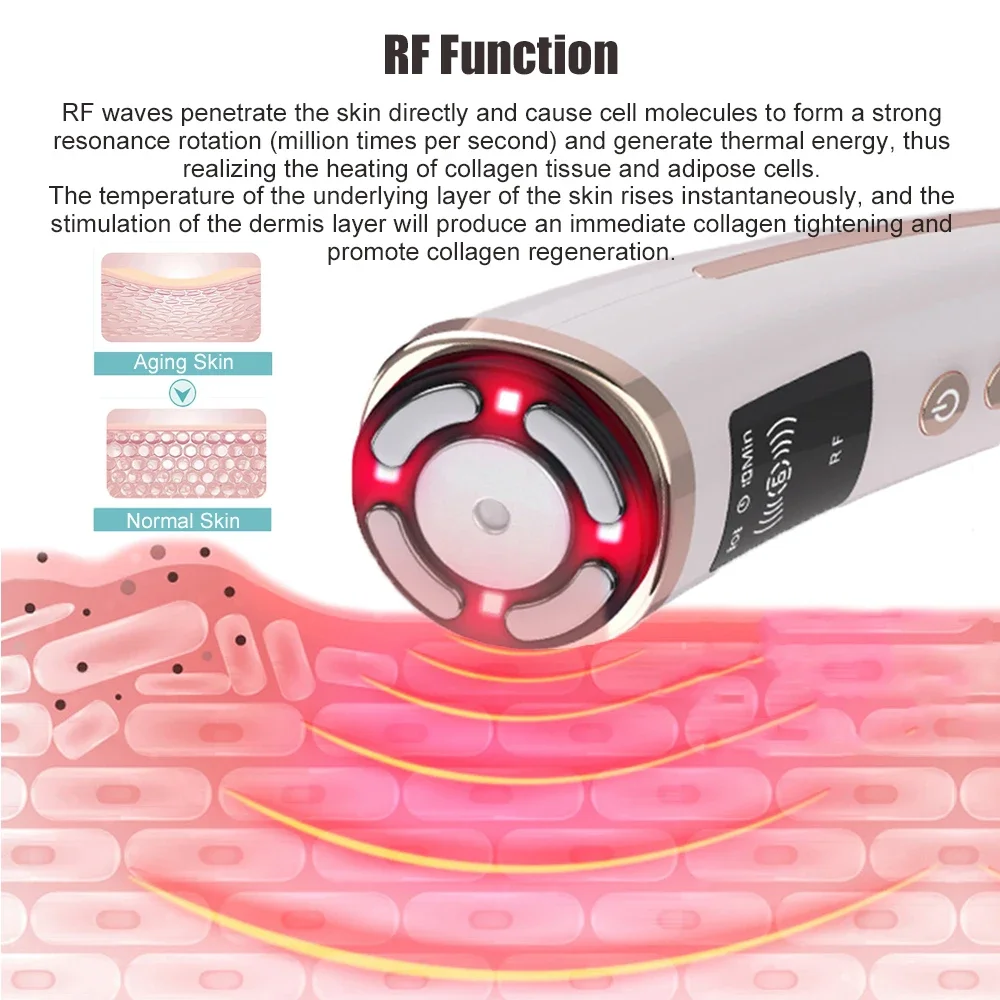 RF waves penetrate the skin directly and cause cell molecules to form a strong resonance rotation (million times per second) and generate thermal energy, thus realizing the heating of collagen tissue and adipose cells. The temperature of the underlying layer of the skin rises instantaneously, and the stimulation of the dermis layer will produce an immediate collagen tightening and promote collagen regeneration. RF has favorable effects in removing wrinkles, eliminating scars, restoring skin elasticity and luster, lipolysis, and body slimming.