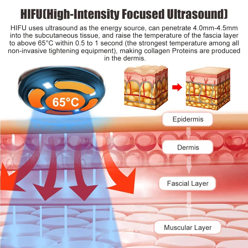 HIFU (High-Intensity Focused Ultrasound) is a non-invasive (non-traumatic) ultrasonic technique directly acting on the fascia layer. With ultrasonic waves as the energy source, HIFU makes use of its penetrability and focusability to focus the ultrasonic energy emitted by ultrasonic waves on the fascia layer of the human body. It forms an area with higher sound intensity within the fascia layer. It may go deep into subcutaneous 4.0mm-4.5mm, elevate the temperature of the fascia layer tissue to over 65°C (the strongest temperature of all non-invasive firming equipment) within 0.5 to 1 second, so as to make collagens within the fascia layer tissue regroup and not damage the normal tissue beyond the focus area, and further improve the fascia.