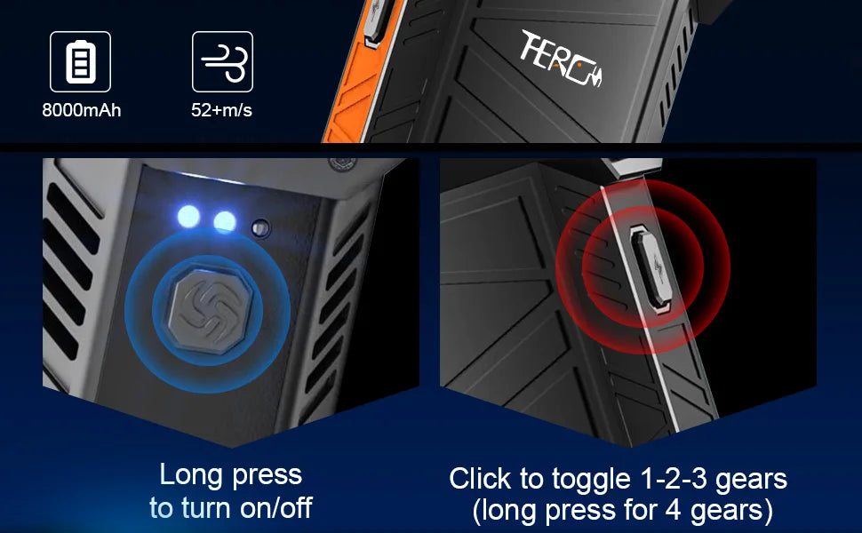 Motor speed up to 150,000RPM, maximum wind speed over 52 m/s. 4 adjustable speed settings to meet the needs of different scenarios, such as: (cleaning desktop and keyboard dust, drying pet hair, inflating air mattresses and lifeboats, Ideal for outdoor activities such as picnics and fires)