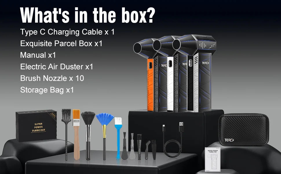 Compressed air duster includes USB Type-C cable, user manual, gift storage bag and cleaning brush. 5V2A power adapter is recommended. WARM NOTE: For safe use, please avoid overcharging and do not place near heat sources or flammable materials.
